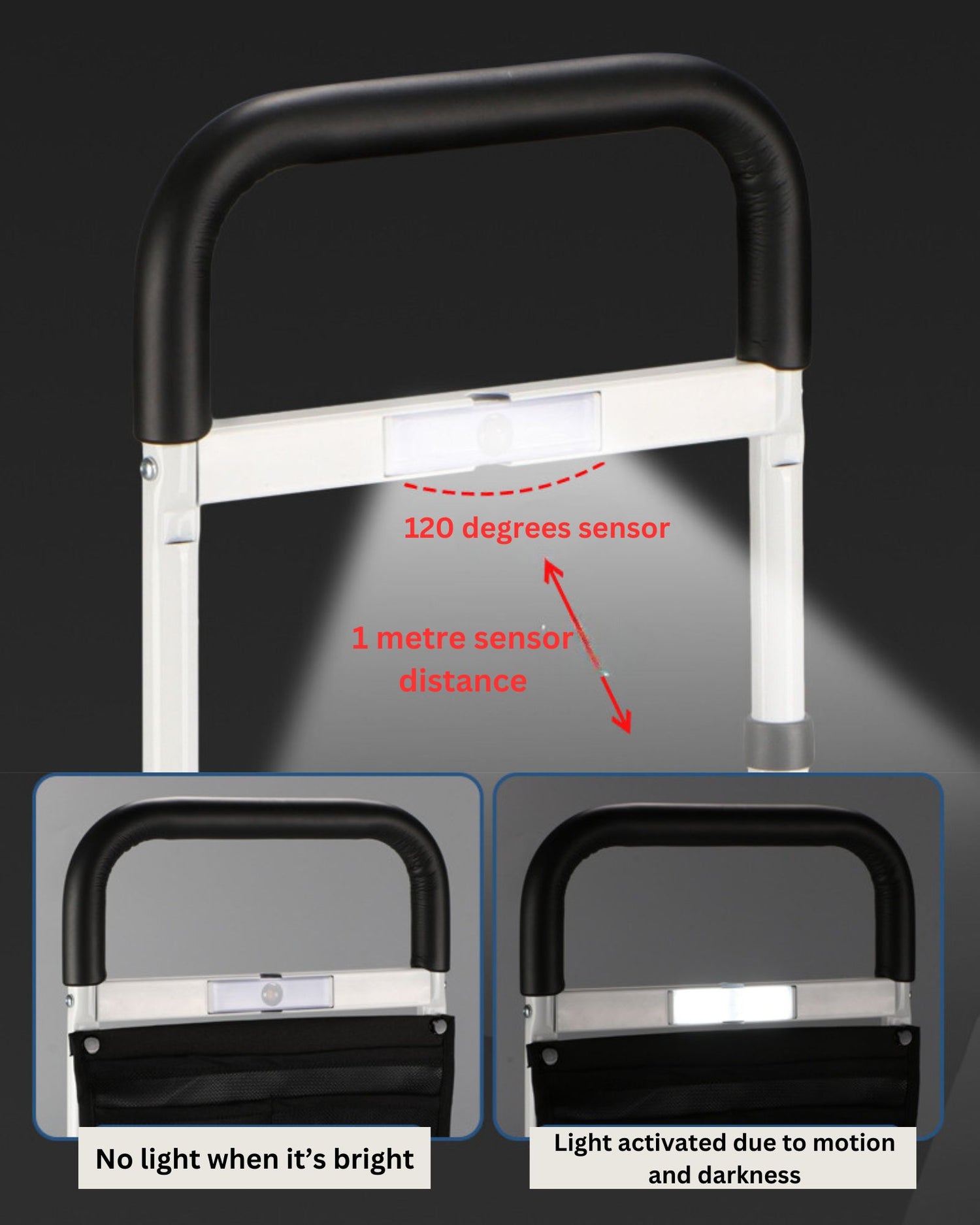 The integrated side table folds away when not needed, while the ground support legs provide additional stability without compromising mobility. Motion-sensing light activates automatically, ensuring safe navigation during nighttime activities.